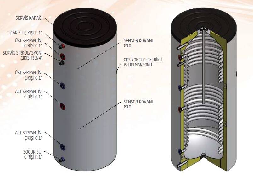 Bağlantılar: Soğuk/sıcak su giriş-çıkış, çift serpantin bağlantıları