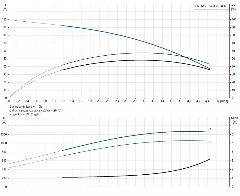 CR3-15 A-FGJ-A-E-HQQE 3x230/400V 50Hz dikey çok kademeli santrifüj pompa, CR3 serisinin yüksek debi ve yüksek basınç gerektiren endüstriyel uygulamaları için geliştirilmiş güçlü bir pompa modelidir. CR3-15 pompa, 3 m³/h nominal debi sınıfında çalışır ve 15 kademeli hidrolik tasarımı sayesinde hem yüksek basınç üretir hem de enerji verimliliğini maksimum seviyede tutar.