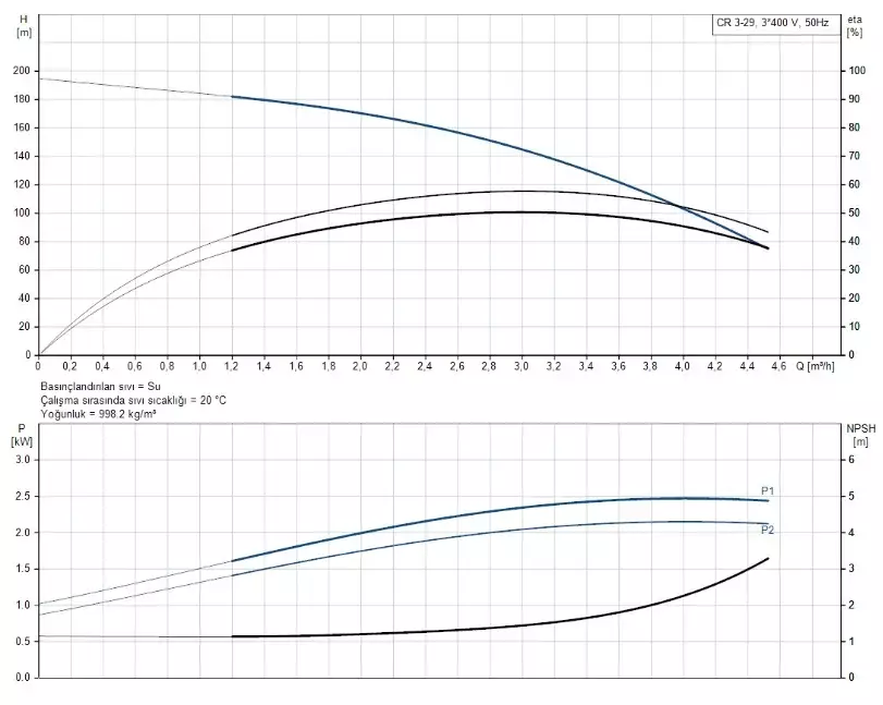 CR3-29 A-FGJ-A-E-HQQE 3x230/400V 50Hz dikey çok kademeli santrifüj pompa, 3 m³/h debi sınıfında aşırı yüksek basınç gerektiren endüstriyel proses hatları, su arıtma sistemleri, filtrasyon uygulamaları ve yüksek basınçlı hidrofor çözümleri için geliştirilmiş en güçlü CR3 serisi modellerinden biridir.