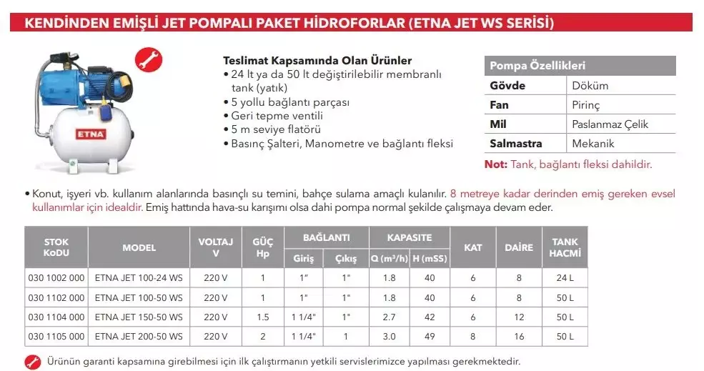 Konutlarda, yazlıklarda, müstakil evlerde, küçük işletmelerde, işyerlerinde ve bahçe sulama amaçlı uygulamalarda sıkça tercih edilen ETNA JET 150-50 WS; yüksek basınç, büyük tank kapasitesi, stabil su akışı ve uzun ömürlü kullanım deneyimi sunar.