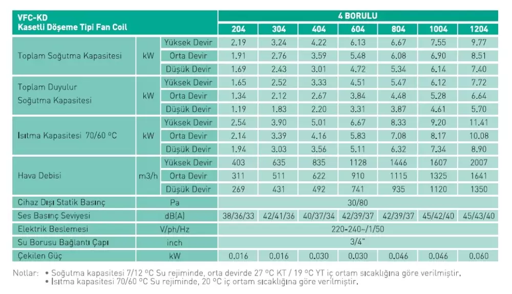 Ventas VFC-KD 404, 4,1 kW orta soğutma kapasitesi ve 9,2 kW ısıtma kapasitesi ile orta ölçekli mekanlarda güçlü performans sunan 4 borulu kasetli döşeme tipi fancoil modelidir.