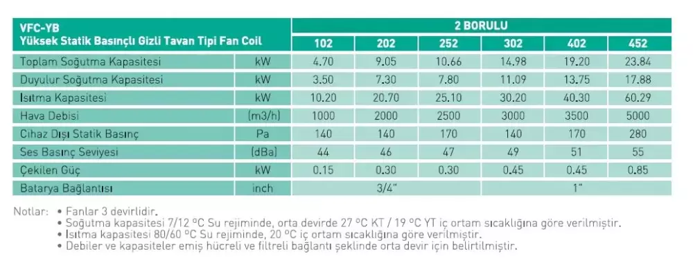 Ventas VFC-YB 402, 17,9 kW orta soğutma kapasitesi ve 47,2 kW ısıtma kapasitesi ile çok geniş alanlarda yüksek performans sağlayan 2 borulu yüksek basınçlı fancoil modelidir.