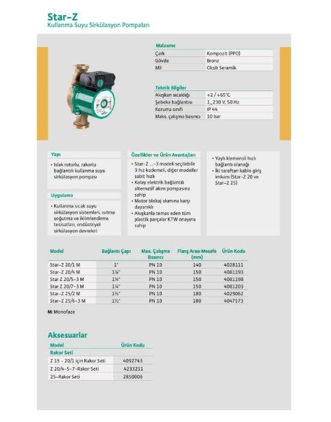 Wilo Star Z 20/7-3M, bronz gövdesi sayesinde içme suyuna uygun, dayanıklı ve uzun ömürlü bir kullanım sıcak suyu resirkülasyon pompasıdır.